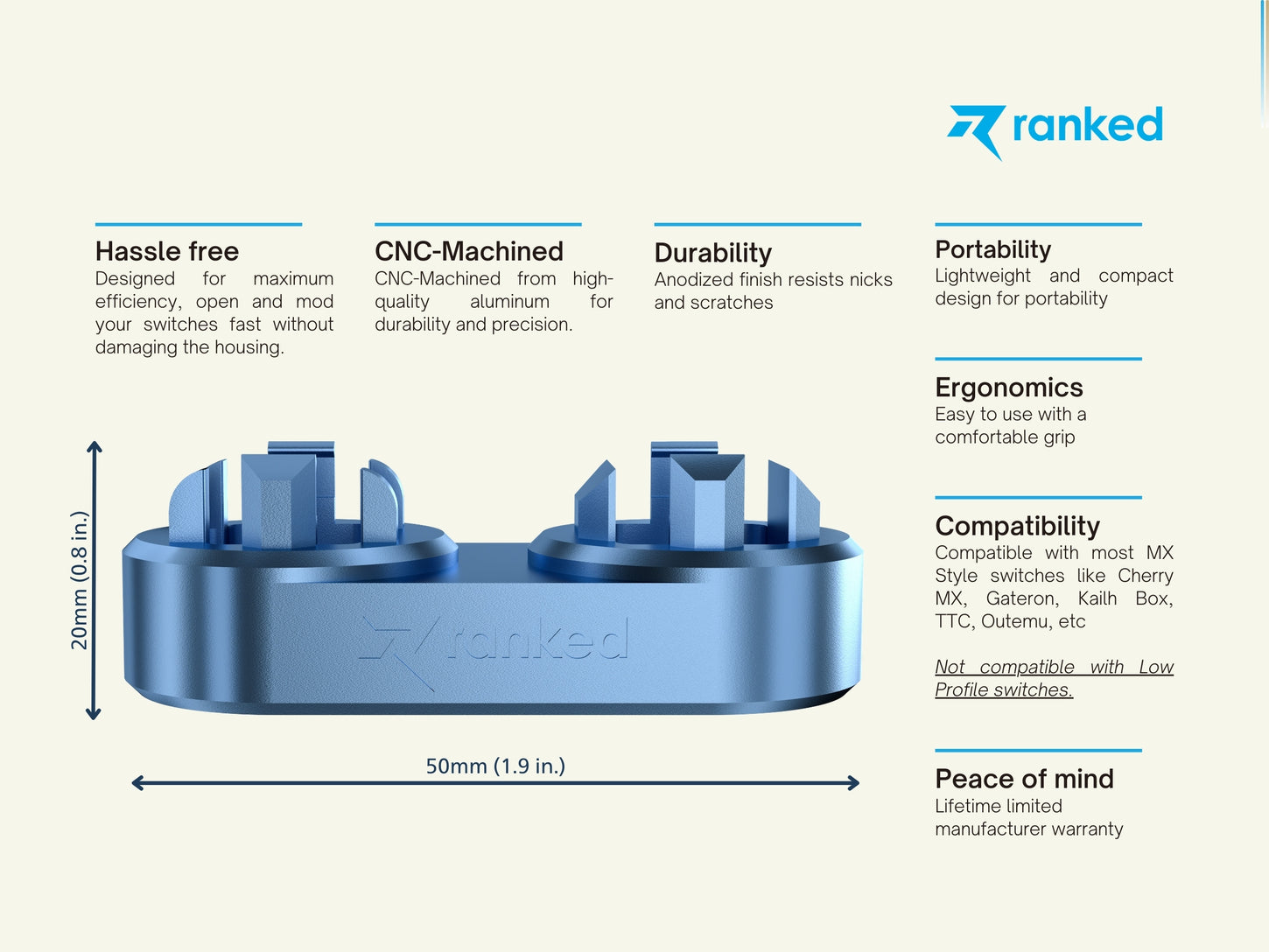 Ranked switch opener is an aluminum CNC machined and multifaceted one-stop tool for opening both Cherry MX, Gateron & Kailh Box switches. Lightweight and ultra durable, you'll be able to pile through entire sets of switches in minutes, allowing you to focus on fine detail over mundane tasks. At Ranked we don't just value time and longevity of our equipment but also our wellbeing. Gone are the days of wasted time with cuts and blisters. This is it, the only one you'll ever need, portable and strong - a forever tool.